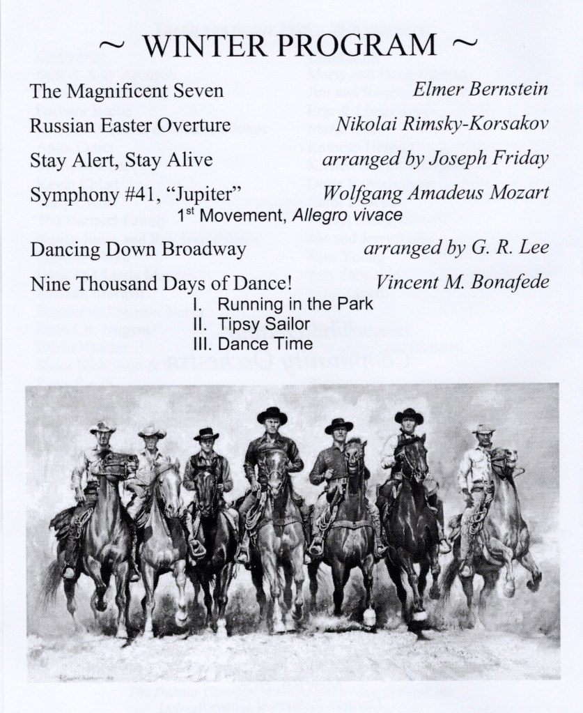 Here are the compositions we have recently performed. We enjoy playing classics, pops. show tunes, and original compositions and compilations created by our talented conductors. Some are from our library and some are commissioned or written just for us.