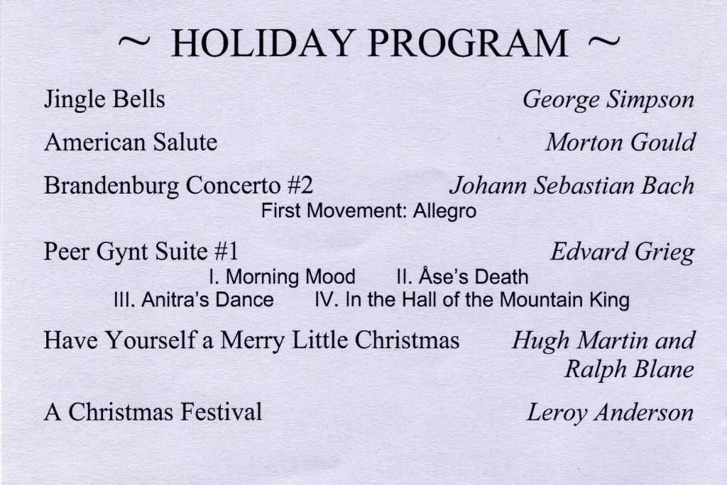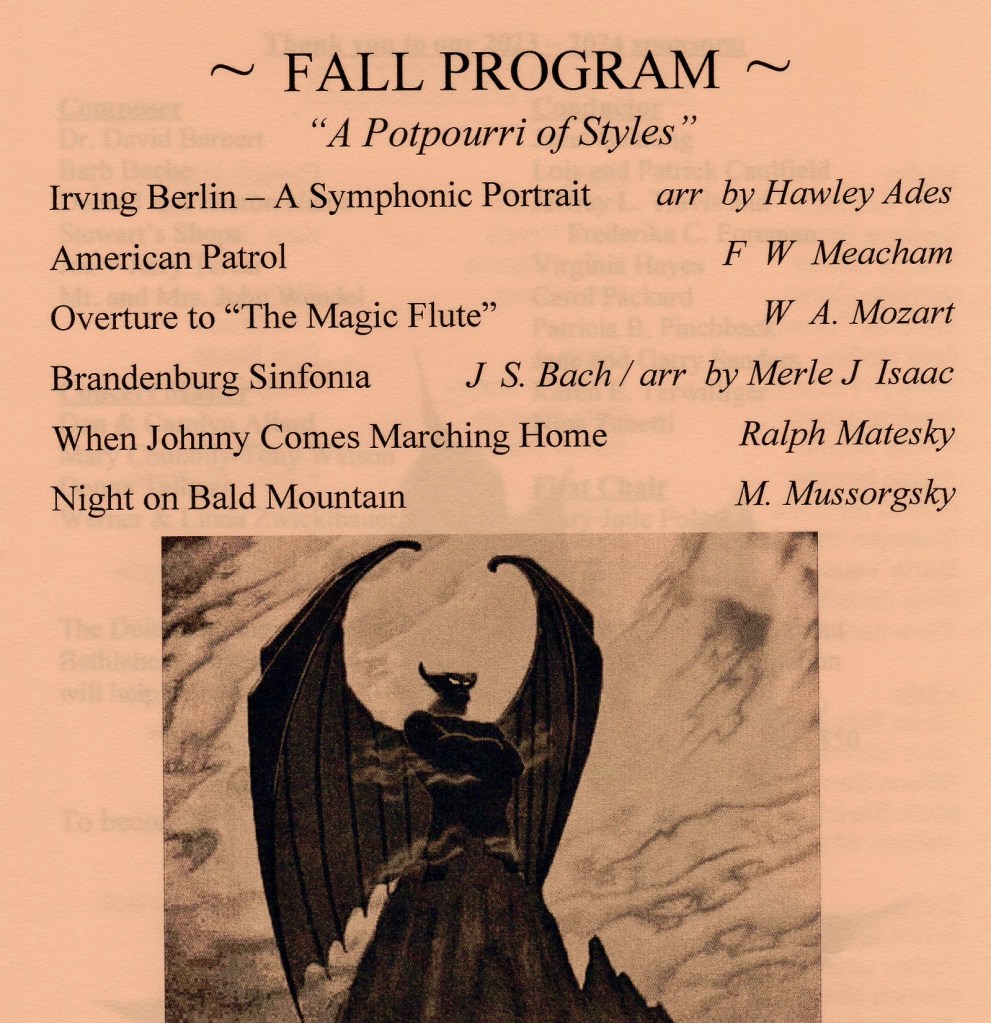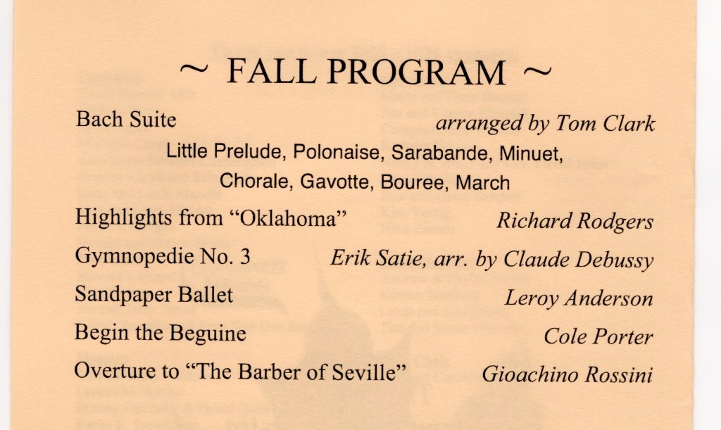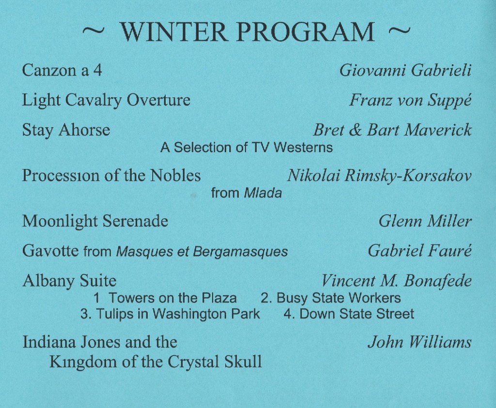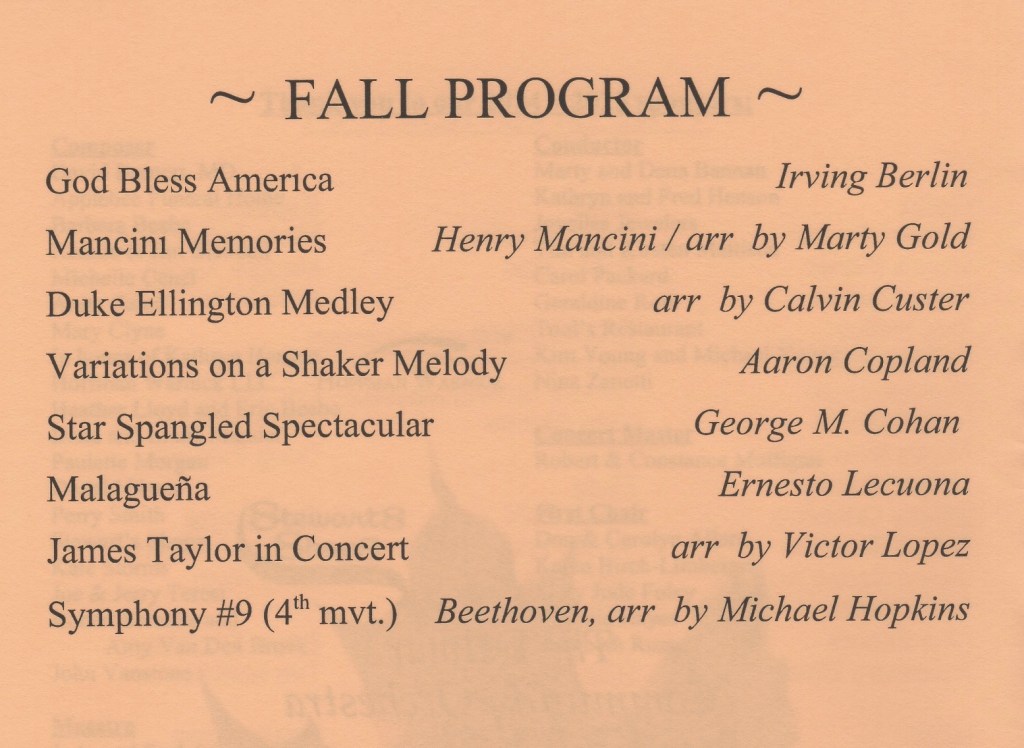 Here are the compositions we have recently performed. We enjoy playing classics, pops. show tunes, and original compositions and compilations created by our talented conductors. Some are from our library and some are commissioned or written just for us.