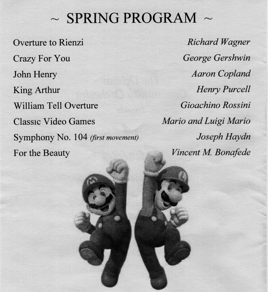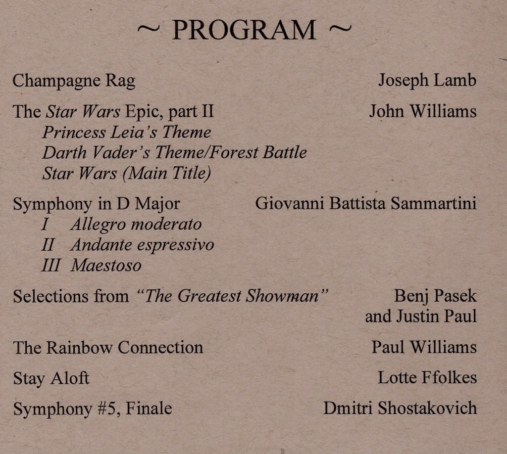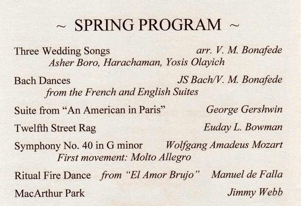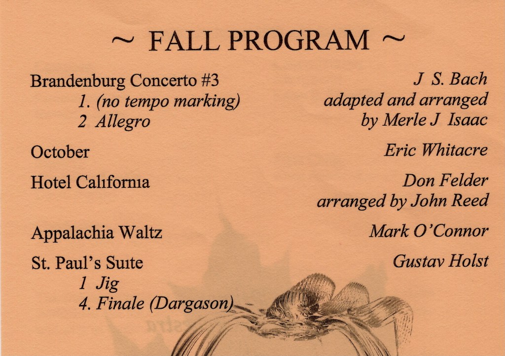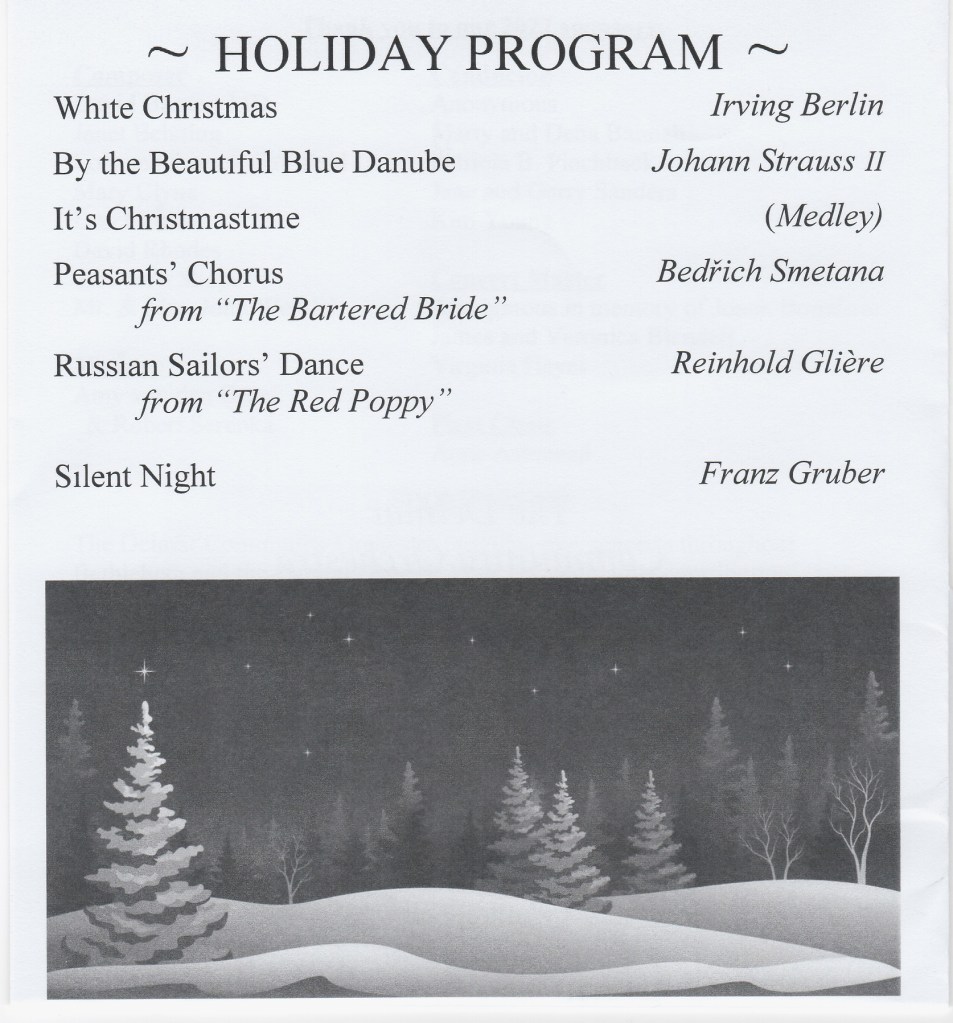 Here are the compositions we have recently performed. We enjoy playing classics, pops. show tunes, and original compositions and compilations created by our talented conductors. Some are from our library and some are commissioned or written just for us.